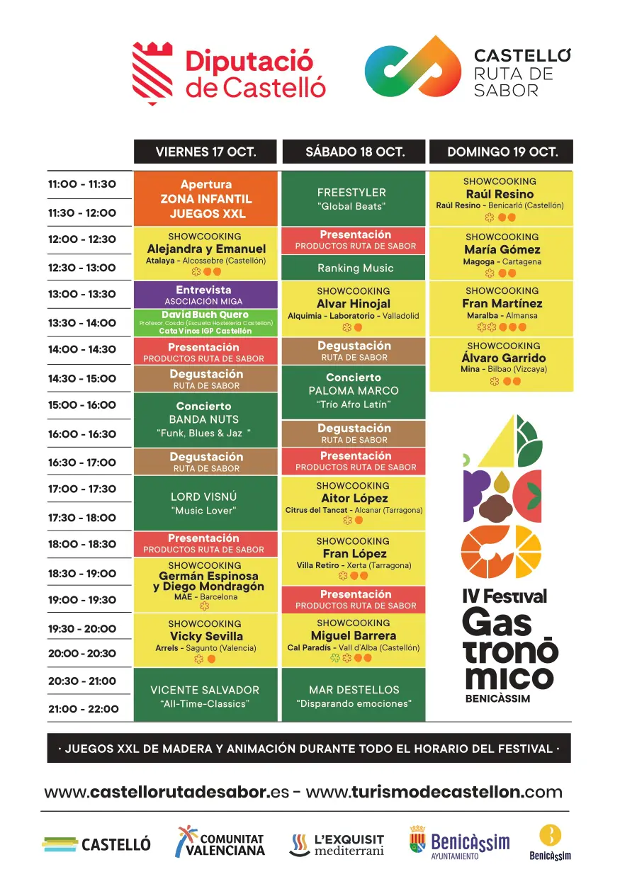 La cuarta edición del Festival Gastronómico Castelló Ruta de Sabor se celebrará los días 17, 18 y 19 de octubre en el anfiteatro Pepe Falomir, en Benicàssim, convirtiéndose en un punto de encuentro esencial para los amantes de la gastronomía, los productos locales y la cultura culinaria de la provincia de Castellón.