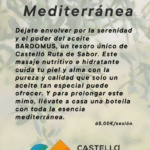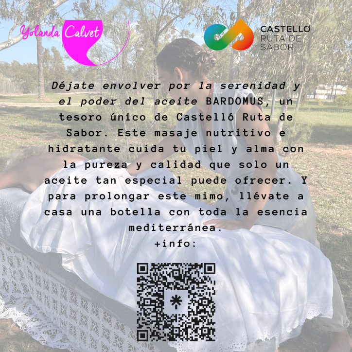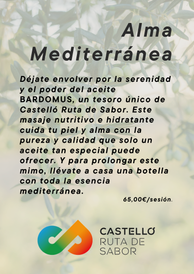 Déjate envolver por la magia del Mediterráneo en una experiencia que combina relax, naturaleza y sabor. Un masaje exclusivo con aceite Bardomus, elaborado en Castellón, que hidrata, nutre y conecta cuerpo y alma con la autenticidad de la tierra. Y para que la experiencia continúe en casa, llévate una botella de este oro líquido que guarda toda la esencia mediterránea.